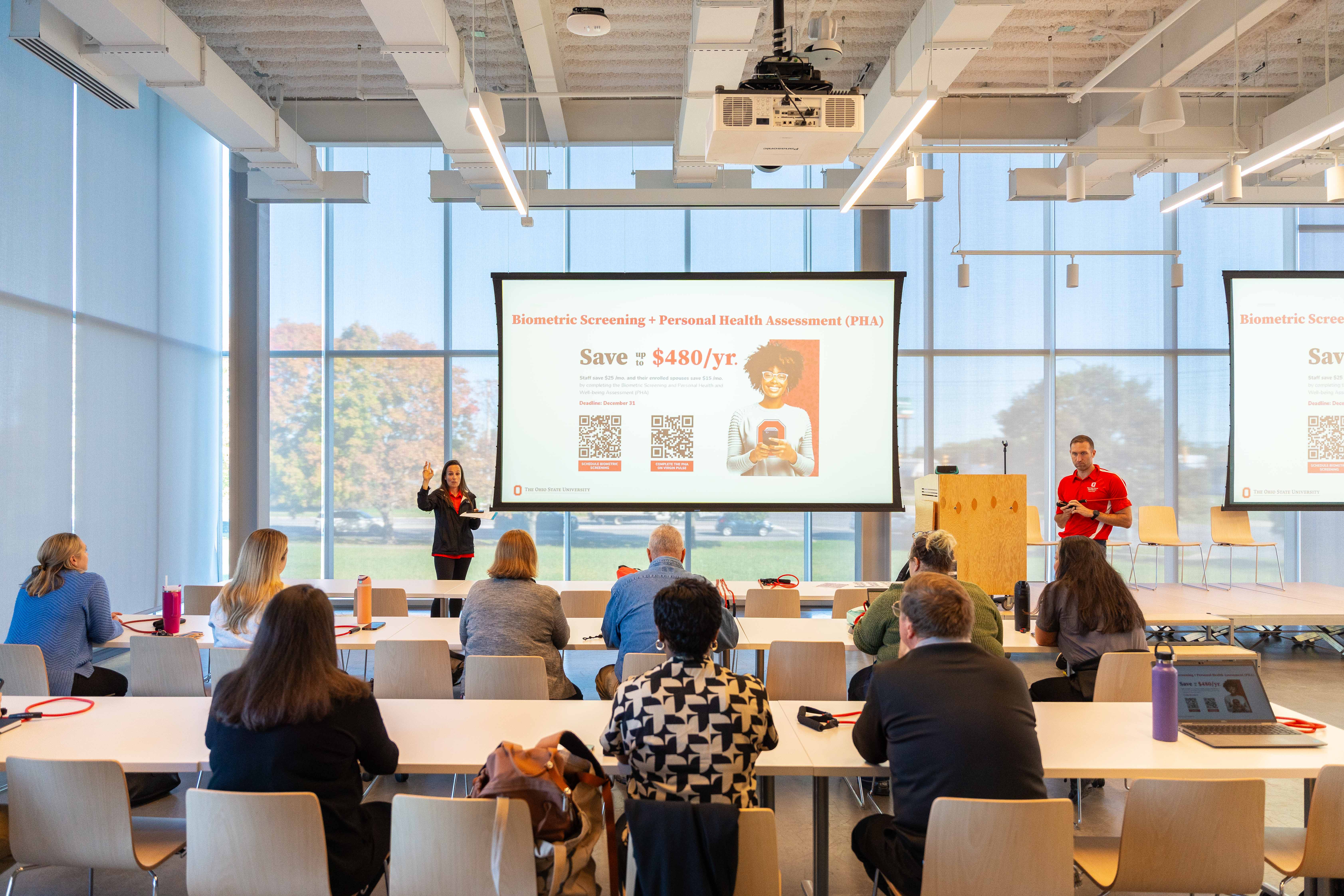 In October, the A&P BWI’s teamed up with Ohio State experts from the Health Plan’s Personal Health Coaches and the Employee Assistance Program (EAP) for a fall gathering of interactive presentations to learn more about wellness offerings available to Ohio State staff. The event took place on the heels of an annual presentation of physical health assessment (PHA) survey data given by Bernadette Melnyk, PhD, RN, vice president for health promotion, university chief wellness officer. 2023 survey findings for A&P indicated opportunities for increased physical activity, nutrition improvement and stress management. The meeting sessions were informed by A&P BWI’s interests and aligned with future opportunities in A&P.