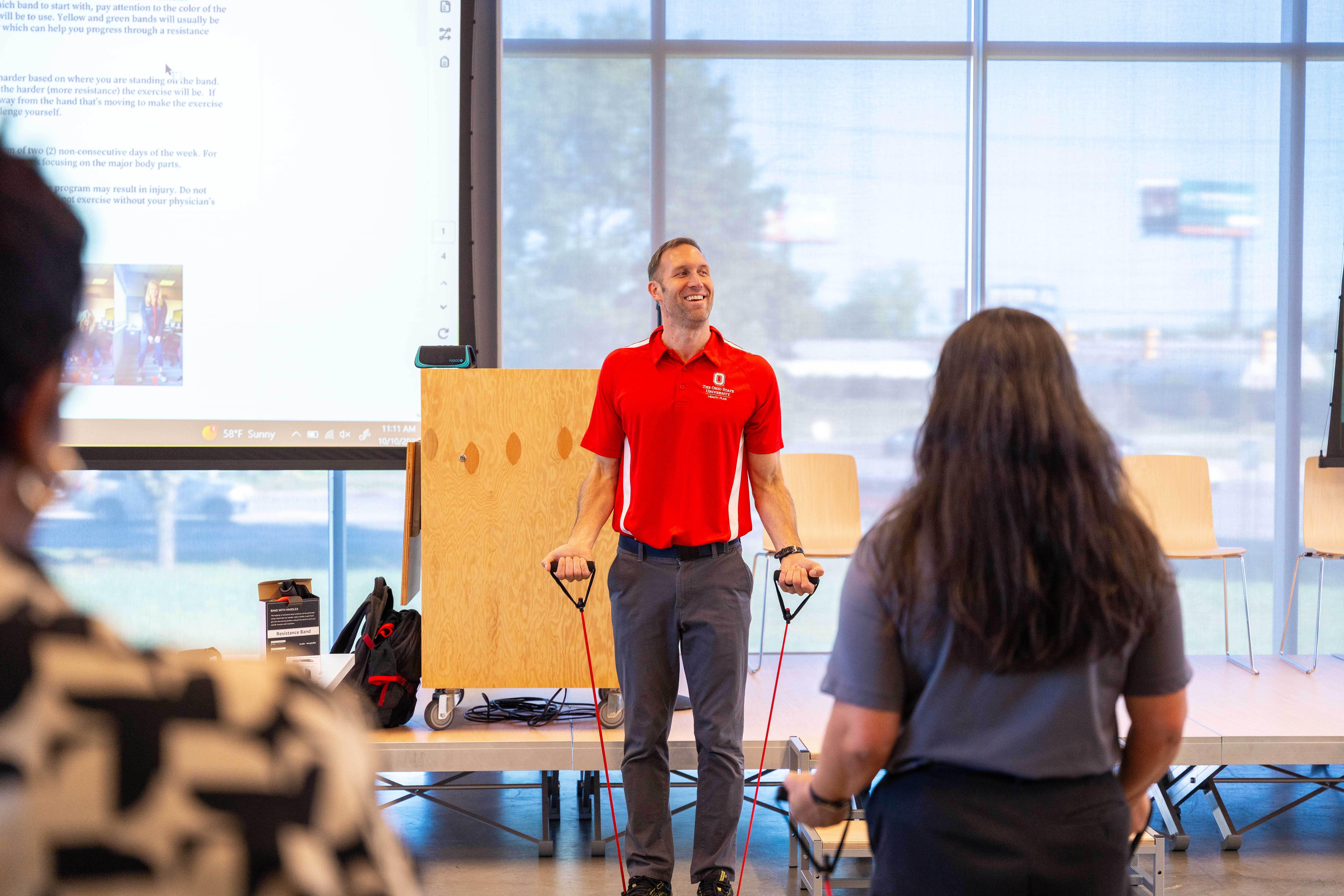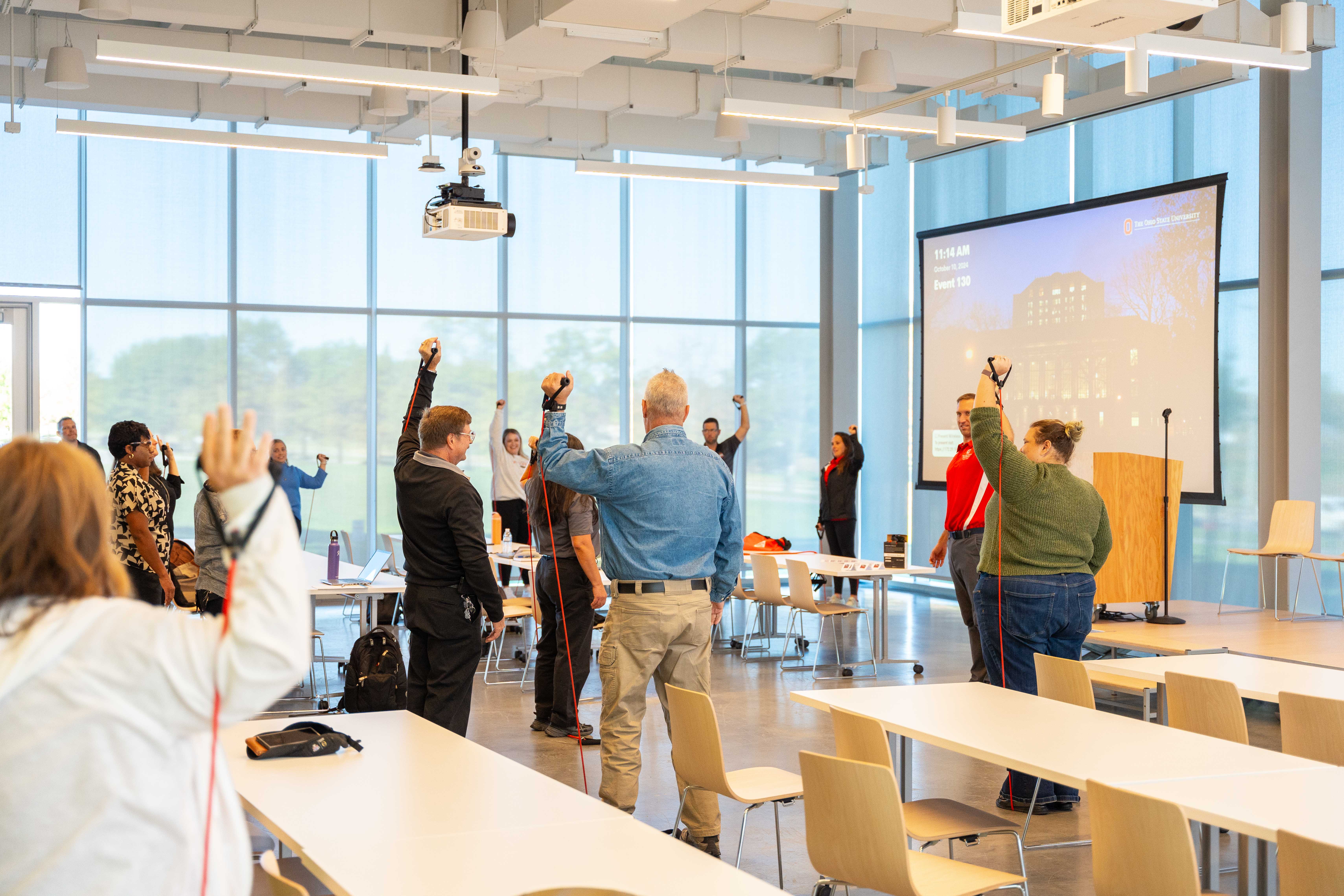 Michael Bramlish, Ohio State health coach, kicked-off the A&P BWI session with a resistance band demonstration, discussing the physical and mental health benefits of resistance training. With lively music playing in the background, participants were given resistance bands to try various exercises and work with partners on correctly implementing stretches. “Health coaching is a free service for benefits-eligible staff and is a great way to help Buckeyes achieve their personal wellness goals,” said Bramlish. “Today’s event is a great example of the ways we partner with departments as well as staff, one-on-one, to tailor programming for everyone’s unique needs.”