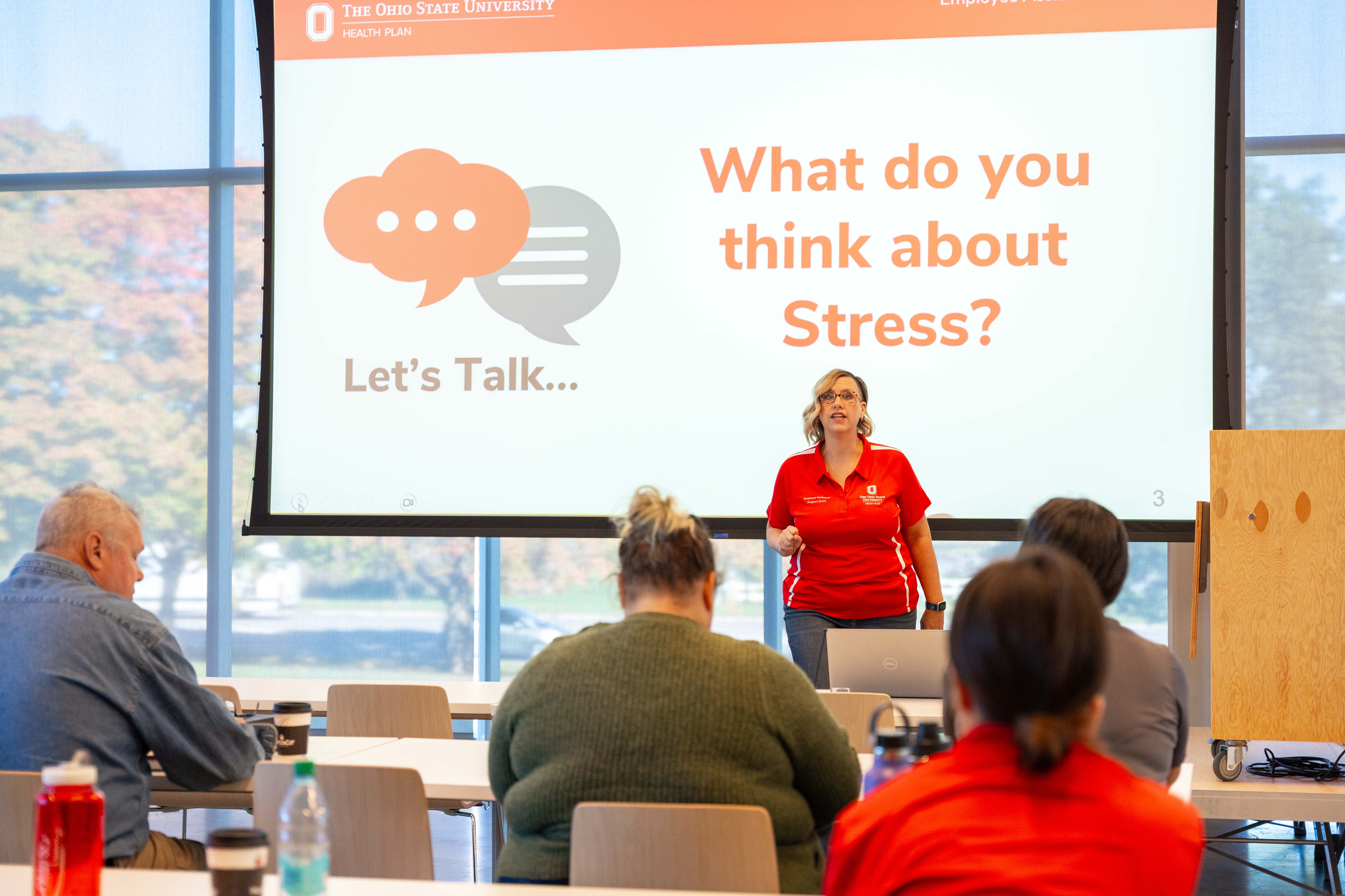 After a healthy lunch from Café Carmenton inside the Energy Advancement and Innovation Center (EAIC), the focus shifted toward a group discussion about stress, led by Helka Casey, senior counselor with the Employee Assistance Program (EAP). While stress can often times have a negative connotation, the presentation focused on ways to use physical indicators of stress to understand and manage our stress response in our daily lives. “It’s important for staff to know that we are available to make their lives a little easier with the resources we provide,” said Casey. “Whether it’s counseling services, stress management strategies, resource locators for a variety of needs, and so much more, we’re here to work with staff to enhance their overall well-being as well as the well-being of their family.”