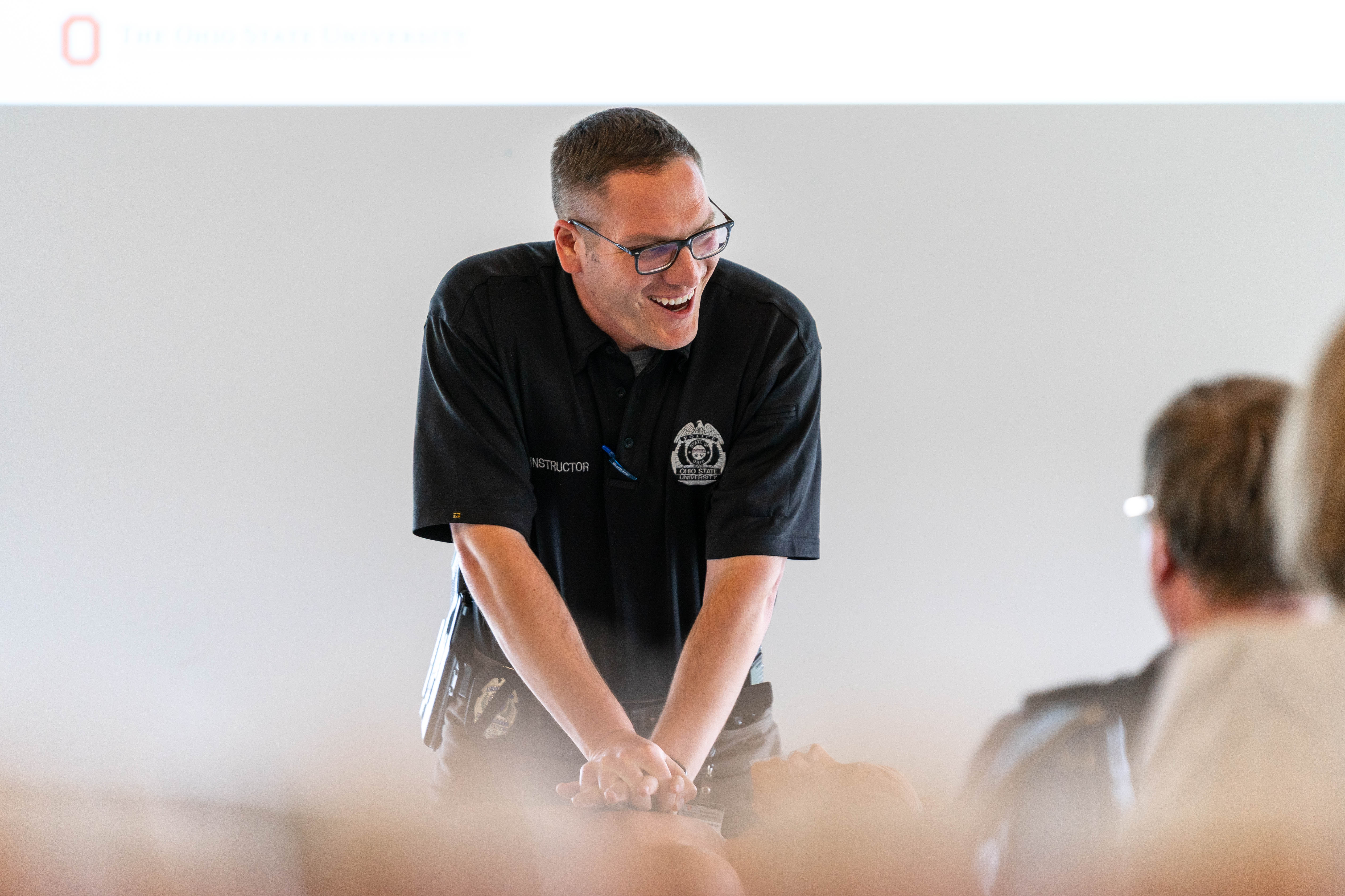 The event began with the introduction of the new Your Plan for Health (YP4H) Summer Walking Challenge before participants moved into an interactive session on Cardiopulmonary Resuscitation (CPR) and Automated External Defibrillator (AED) led by the Ohio State University Police Division (OSUPD). Attendees learned how to recognize cardiac emergencies, perform chest compressions and properly use an AED.