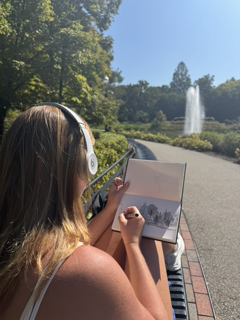 An artist sketching the beauty of Mirror Lake as FOD crews work hard to keep landscaping pristine.